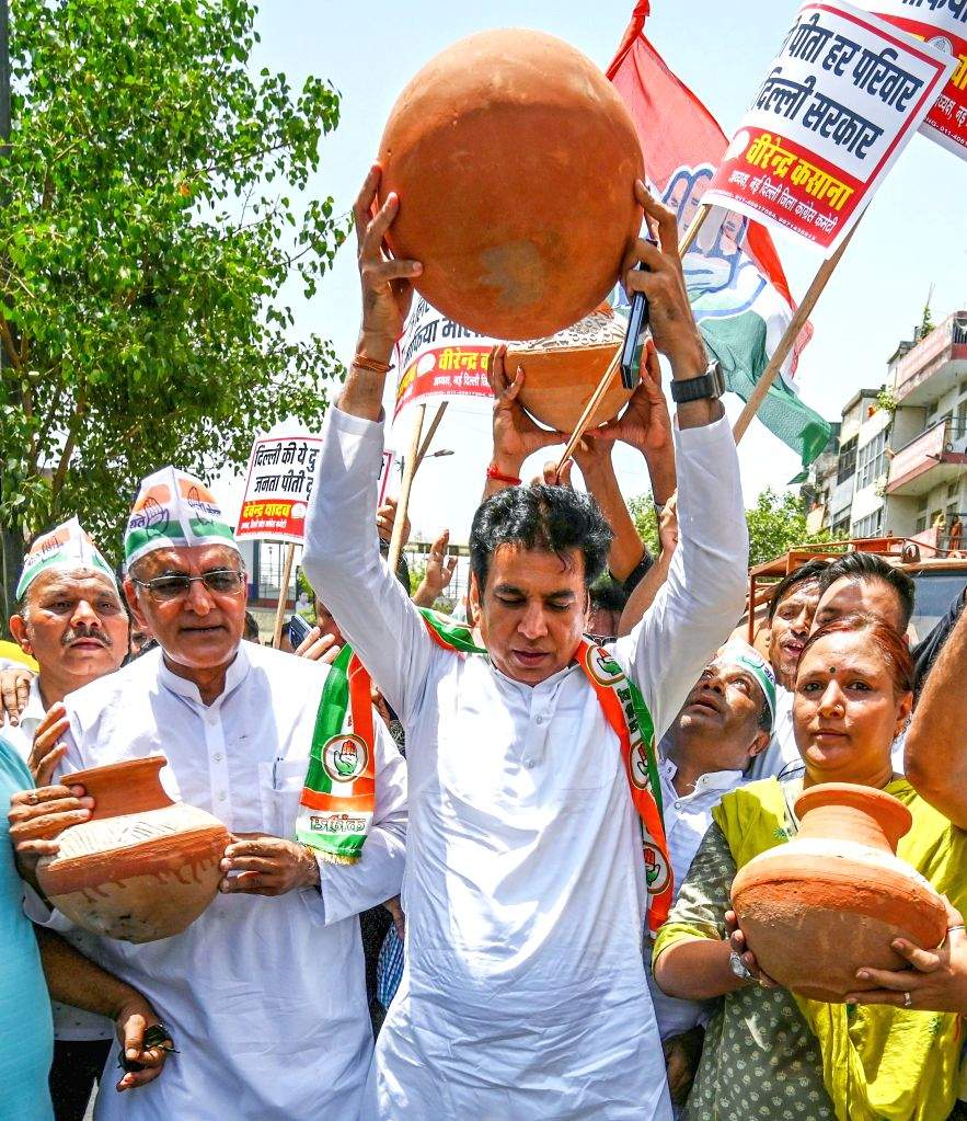 सिर पर मटके और हाथ में कांग्रेस के झंडे लेकर प्रदर्शनकारियों ने दिल्ली सरकार और मुख्यमंत्री अरविंद केजरीवाल के खिलाफ नारेबाजी की। बाद में, उन्होंने मटकों को जमीन पर पटककर फोड़ दिया।