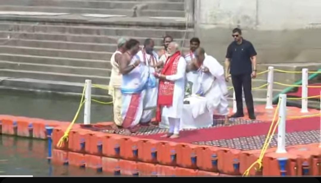 वाराणसी, 14 मई : लोकसभा चुनाव के लिए वाराणसी सीट से नामांकन के पहले मंगलवार सुबह प्रधानमंत्री नरेन्द्र मोदी ने दशाश्वमेधघाट पर वैदिक मंत्रोच्चार के बीच मां गंगा का पूजन किया। गंगा सप्तमी घाट पर बने खास जेटी पर वैदिक ब्राम्हणों की आचार्यत्व में प्रधानमंत्री ने पूरे श्रद्धाभाव से मां गंगा का दुग्धाभिषेकर कर पूजन किया और जीत का आशीर्वाद मांगा। इस दौरान घाट पर मौजूद हजारों लोगों ने हर-हर महादेव का उद्घोष कर प्रधानमंत्री का अभिवादन किया।