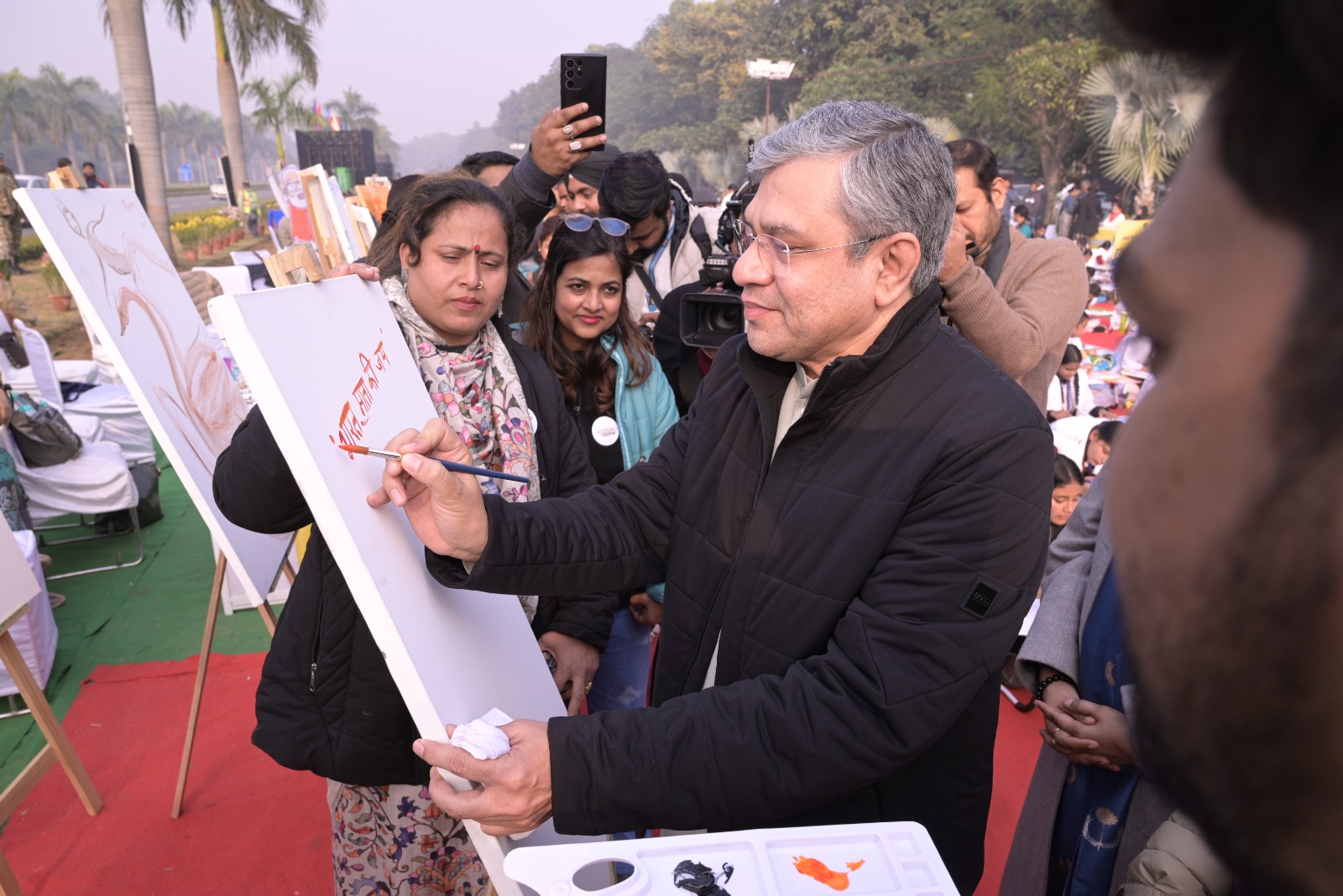 नई दिल्ली, 04 जनवरी: केंद्रीय सूचना एवं प्रसारण मंत्री अश्विनी वैष्णव ने एनडीएमसी की ‘एग्जाम वॉरियर’ पहल में छात्रों से बातचीत करते हुए कहा कि अगर परीक्षा को जुनून के रूप में लिया जाए तो सफलता के मार्ग में बाधा और तनाव कोई चिंता उत्पन्न नहीं होती। उन्होंने सभी विद्यार्थियों को सुझाव दिया कि जीवन की प्रत्येक परीक्षा को जुनून के साथ लिया जाना चाहिए। इससे पूर्व उन्होंने विद्यार्थियों से संवाद भी किया तथा उनसे उनकी चित्रकला की थीम से संबंधित प्रश्न भी पूछे। अश्विनी वैष्णव शनिवार को नई दिल्ली नगरपालिका परिषद (एनडीएमसी) द्वारा आयोजित प्रधानमंत्री द्वारा लिखित पुस्तक “एग्जाम वारियर्स” थीम पर एक कला महोत्सव-आर्टथॉन में छात्रों का मनोबल बढ़ा रहे थे। इस आयोजन में चाणक्यपुरी के स्कूलों के 4000 छात्रों ने भाग लिया।